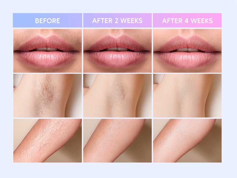 Notice reduced hair growth within the first month. With regular treatments, permanent-level hair reduction is typically achieved in 8–12 weeks using a laser hair removal device.